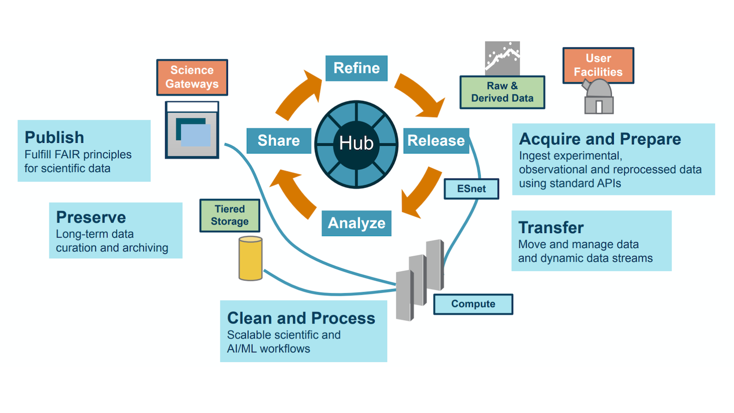 HPDF will offer innovative production data services and software tools to support the entire data lifecycle. A key goal is facilitating data management and interoperability, i.e., making data available to a broad scientific community, providing for new technologies and usage patterns, and preserving data for future use. HPDF will incorporate core capabilities to spearhead scientific data-driven discovery and provide access to data through various services (e.g., data catalogs, search tools) and interfaces (e.g., AI agents, web, and application programming interfaces). The HPDF team will be able to support users through a variety of data lifecycle needs including: